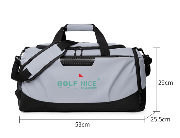 首先,包體采用了簡約而現(xiàn)代的雙色拼接設計,灰黑配色低調卻極富質感,適合各種場合,無論是運動后的小憩還是商務場合的短途旅行,都能彰顯使用者的品位與風范。正面的“GOLF NICE COLLECTION”標志,搭配簡約的紅色旗幟圖案,進一步體現(xiàn)了這款包與高爾夫運動的深度關聯(lián)。